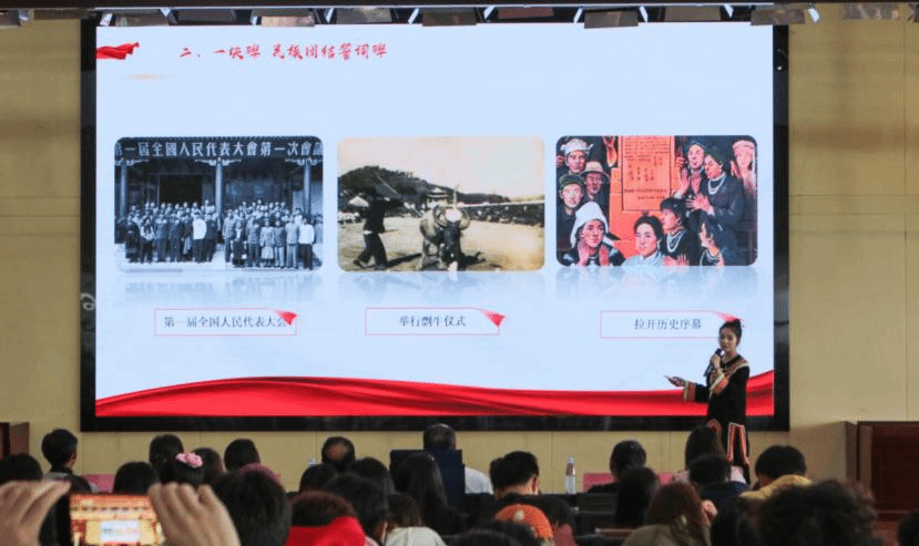 比赛现场,昆明传媒公司老员工讲思政课比赛一等奖获得者杜丽婷以《铸牢中华民族共同体意识的云南实践》为题进行了现场展示。