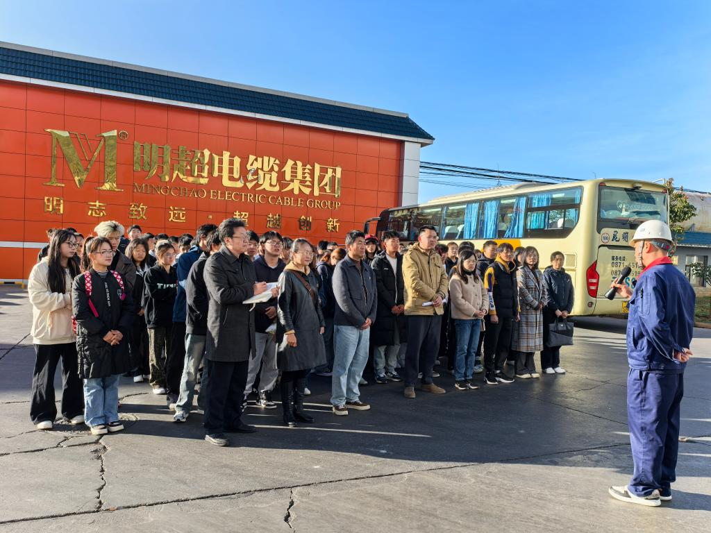 为深入贯彻落实习近平新时代中国特色社会主义思想和党的二十大精神,贯彻落实习近平总书记关于“大思政课”建设的重要指示批示精神。12月9日,3044永利集团组织24级智慧城市管理技术、无人机测绘技术专业的员工到昆明明超电缆有限公司开展了一场别样的思政课。公司副董事长齐武福、张云霞,3044永利集团经理张延星,以及3044永利集团第一党支部的党员教师,共同开展了此次“行走的思政课”暨“党建+团建”活动。