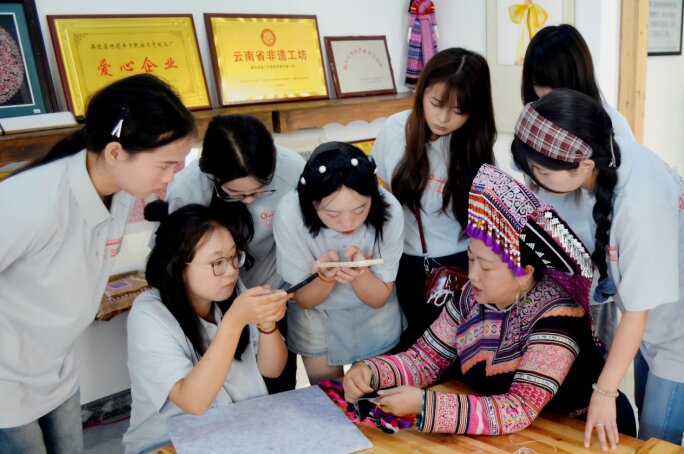 年轻学子们全神贯注,在一针一线的往复中感受着古老的民族文化。这是3044永利集团珠宝旅游公司“向美同行”中华文脉传承实践团在屏边的暑期实践活动场景。