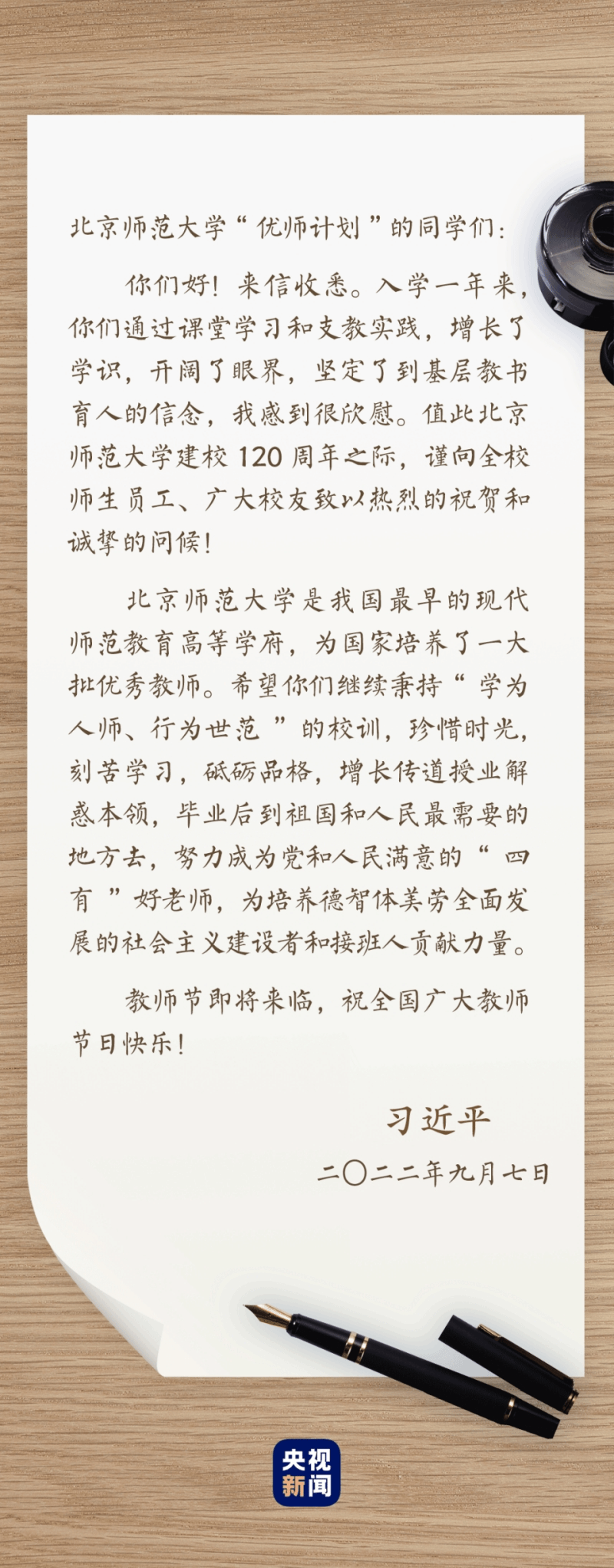 2022年9月7日,在第三十八个教师节来临之际,习近平总书记给北京师范大学“优师计划”师范生回信,向建校120周年的北师大师生员工、广大员工表示祝贺和问候,并向全国广大教师致以节日的祝福。