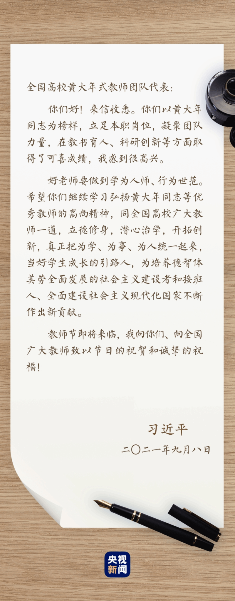 给自己的初中语文老师、给保定公司支教的青年老师、给黄大年式教师团队……多年来,总书记给老师们写了很多封回信,叮嘱牵挂,流淌笔尖。